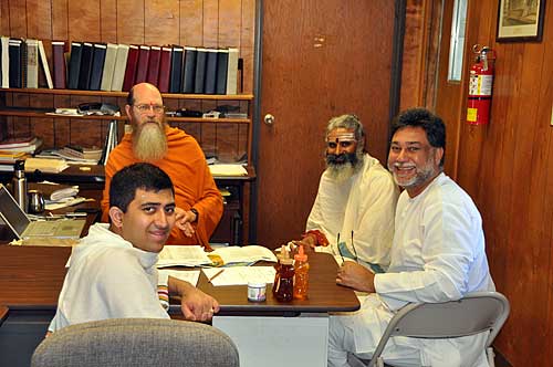 September 19, 2009We recently had some visitors from Canada. Our long time good friend and officiating priest at many of our ceremonies Kandaswamy Gurukkal and two other priests, Bhanu Prakash, Surja Prakash. Here they discuss the on-going work to preserve and bring forward our Saiva Agamas.