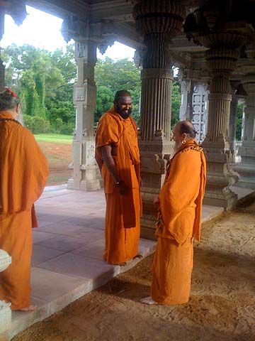 Monks are gathered and admiring the Iraivan Temple main entrance which stands unveiled with scaffolding removed.