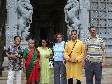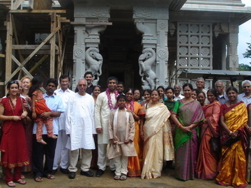 Shivakummar and Shanta Dandappanavara, Sarojini and Natraj Narayanswami, and Aruna and Vikas Pabpat in front of the entrance to the Iraivan Temple.