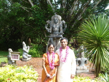Vena Chitturi and Ashwin Cattamanchi arrived with their families and friends for a special blessing prior to their wedding which will take place tomorrow on a beautiful property in Kilauea on Kauai. Following a wonderfully uplifting puja in the Kadavul Temple, they and their large wedding party toured the very beautiful Iraivan Temple.