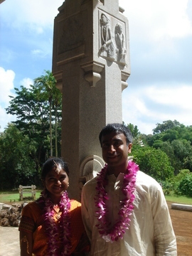 Vena and Ashwin pose in front of the granite pillar depicting the Tirukalyanum or Hindu wedding. Immortalized in stone, one can see the groom leading his bride by the hand taking those seven steps around the homa fire - symbolizing those seven sacred vows.
