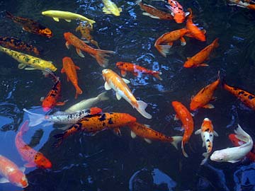 Koi were developed from common carp in Japan in the 1820s, and are still very popular there as they are a symbol of love and friendship. Koi are sprinkled all through the Aadheenam's many pools.