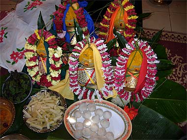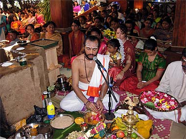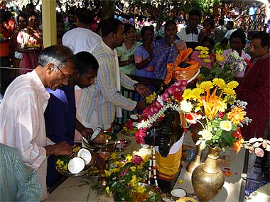 Sivachariya Deva Kumar, priest from Tanjavur, South India was there early to set up everything for the ceremony. Bunches of showy jade vine flowers which are of a highly unusual blue-green to adorn the Lord.