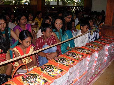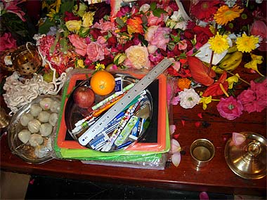 Piles of exercise books at the Feet of Lord Ganapati. These copybooks will be distributed to all students present.