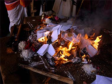 Thousands of prayers were burnt on that day. There were so many written prayers that the large homa pit was over filled up.
