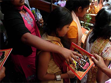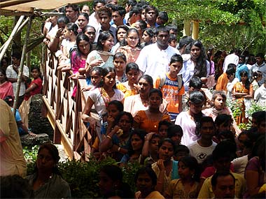 So many youth waiting patiently on the Ganesha Bridge to receive their blessed copy book.