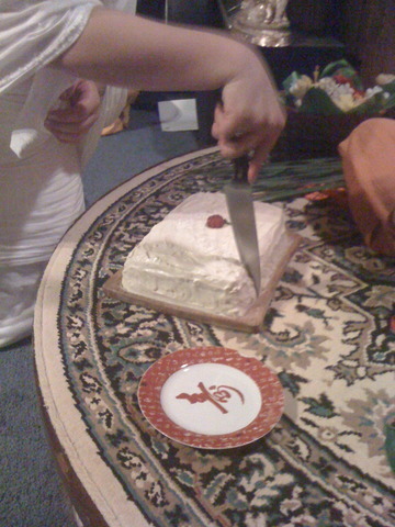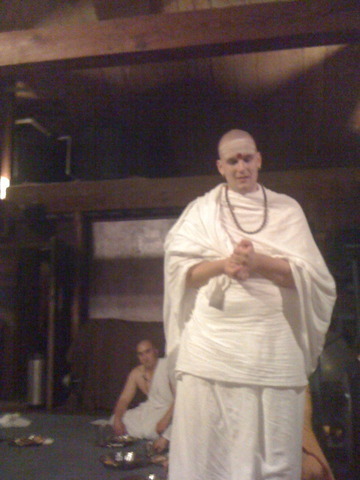 Yum. Sadhaka cuts the first piece for Bodhinatha.