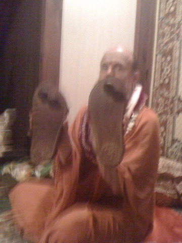 Blurry but telling photos from an iPhone in low light. Here Bodhinatha holds up a pair of sacred sandals, made of Indian Rosewood by Kanda Alahan. With elegant inlays you can barely make out here.
