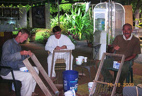 Tandu Sivanathan, Aran Sendan, and and Master Course student, Justice Collier, filling the racks with rudraksha beads to be pressure washed