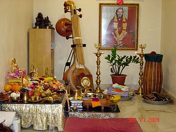 Photo: Shrine room after the puja. Classical instruments such as Veena, Mridangam, Cymbals, Shruthi box, Bharathanatyam bells, Bharathanatyam wooden hitting stick used for making appropriate sounds for the lessons, books and stationeries are offered and seeked for blessings on them.