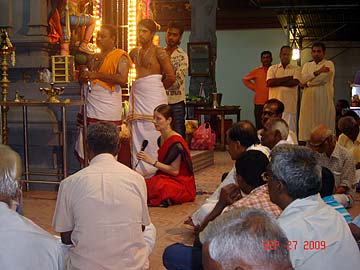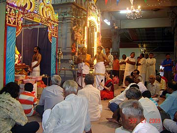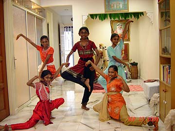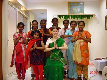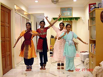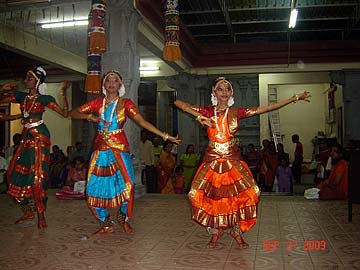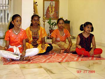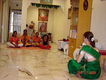 "On Sunday, September 27, 2009 in conjunction with Vijayadashami Prayers also known as Ayudha Pooja, Tirumati Devika Eswaran, invited all her Bharathanatyam and Sangeetham students and their parents for morning Siva puja at our home followed by the student's perfomance, learning of a new lesson and also breakfast feast for all. This observance of Vijayadashami is done in all Hindu arts/cultural centres and schools. It is the most auspicious day for beginning the study of any subject, and on this day every year the students would seek the blessings of God, Gods and Guru to bless their studies during the coming year. Vijayadashami was actually on the following day, which was a Monday, September 28, 2009 but since it was a working and school day for all, so we decided to do it on Sunday itself, which was actually the day for Sarasvathi Puja."