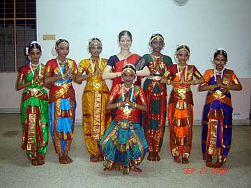 A group photo prior to the performance, with their Natya Guru, Tirumati Devika. Tirumati Devika learned Bharathanatyam from Srimati Mythili Kumar, Artistic Director of Abhinaya Dance Company of San Jose, CA, USA since 1996 and did her Arangetram in 2003.