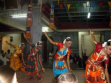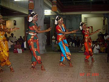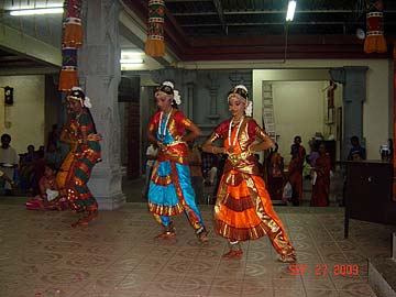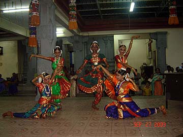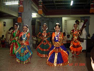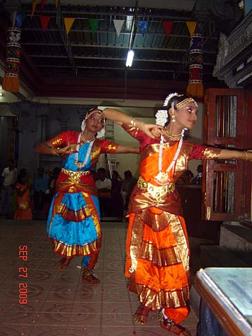 The qualified Bharathanatyam students of Tirumati Devika Eswaran performed for the first time at the Nagarathar Sivan Temple, Dato Kramat Road, Penang, Malaysia. Navarathiri is infact one of the grand temple celebrations in Malaysia and most temples would have daily special pujas, chantings of the 4 vedas and upanishads, processions, and cultural performances like Bharathanatyam and Sangeetham.