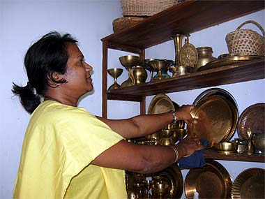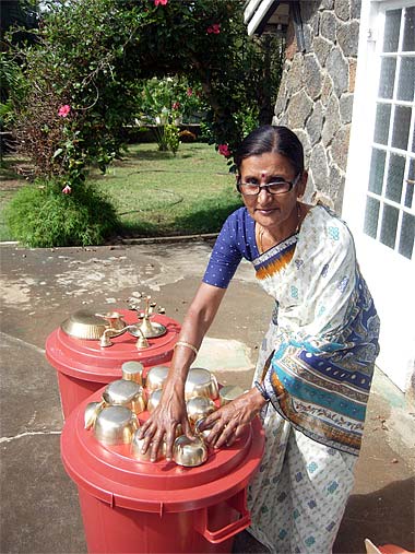 Amma rubbing the brass with tamarind and other substances, washing them and allowing them to dry in the sun. They look as bright as new...
