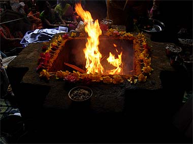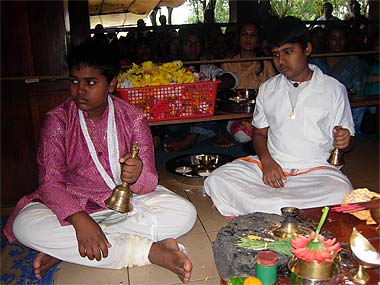 Our two young sishyas ringing the bells while written prayers are being sent into the fire. The sound of the bells attract the devas (angel beings) of the inner worlds.