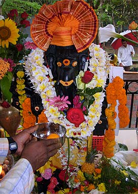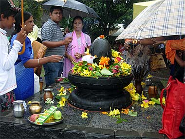 The rain is falling outside, but devotees lovingly offered their worship at the Sivalingum.