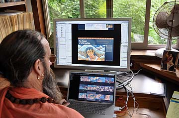 Kumarswami is already hard at work on the April issue of Hinduism Today. Designing and laying out the Insight Section as he does every issue.