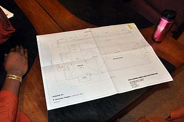 Iraivan Temple construction requires a lot of visioning work...looking into the future. Yoginathswami reviews Selvanathan Sthapati's plans for finishing off Iraivan's roof with Palaniswami in the Cedar Room.