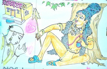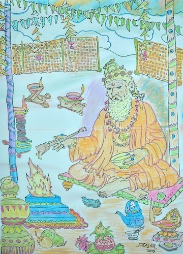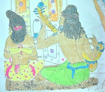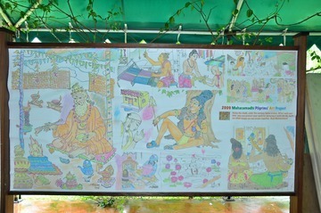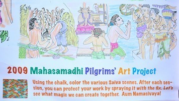 November 17, 2009During the recent Mahasamadhi Observances, all the pilgrims worked together on an art project. It was to take some black and white are and using chalk color the Saiva scenes.