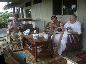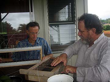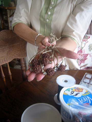 Justice Collier joins Aran Sendan and Brahmachari Rajadeva in stringing racks of Rudraksha beads for power washing.