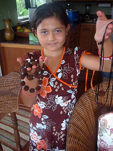 Iraivan morning is held each month by the Wailua Mission of Kauai in an effort to do something creative as a group to help with the building of Iraivan. Here Kulamata Amala Seyon shows Tandu and Uma's granddaughter Leila how to string a necklace.