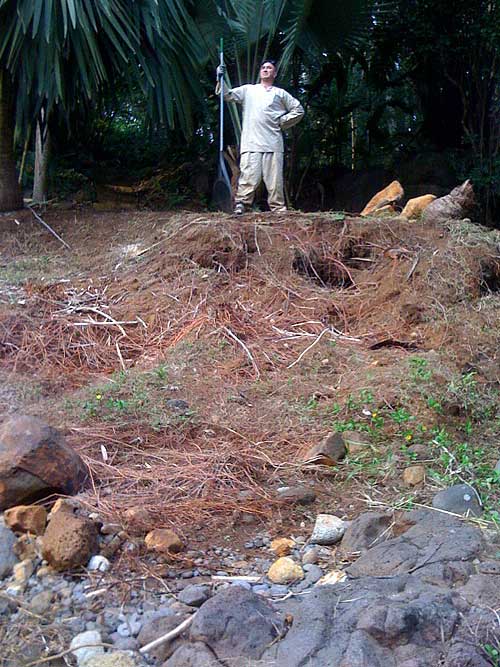 But nothing is to difficult, no challenge too great for the mighty Siddhidata Kulam! In the distance is Sadhaka Rajanatha reveling in a silent in the sunshine. Being this close to nature is always uplifting, even if it is hard work.