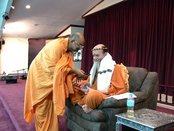 Our dear Bodhinatha was given a seat of honor, a white shawl and a number of little gifts. The swami, in his introduction, spoke of the history of our relationship, of Gurudeva's visit in India, of Bodhinatha's presence at the consecration of their temples in Houston and Toronto.