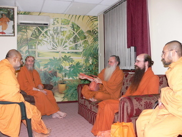 The two swamis who oversee some 300 families in Australia and hundreds more in the larger Asian region (they are on the road almost constantly in performance of their duties) greeted us, placed the auspicious tilak on our foreheads and tied the traditional red rakhi (string) on our wrists to mark their affection and our connectedness. On the far left is Sadhu Adarshmuni Swami and next to him the senior monk in the Asia-Pacific region, Sadhu Jnanpurush Swami (Ruda Swami).