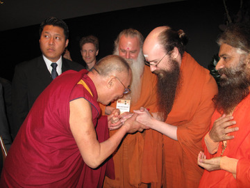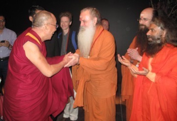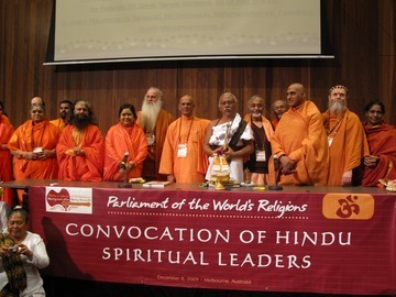 December 14, 2009A photo at the Convocation of Hindu Spiritual Leaders, taken with the banner we designed and hand-carried to Melbourne. The Balinese priest in the center gave a powerful final blessing, and when he sprinkled the water around, almost all of it came onto Bodhinatha who was standing in front of the table at the time!
