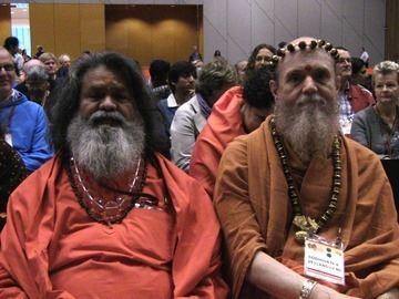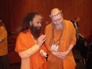 Useful and important conversations took place, not in the official councils, but in the halls and lobbies of this huge, brand new convention center. Here Bodhinatha speaks with Swami Chidanand Saraswati "Muniji" who is his host next year for the holy bathing in the Ganges during Kumbha Mela.