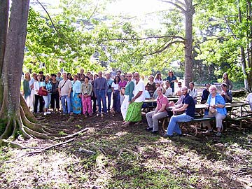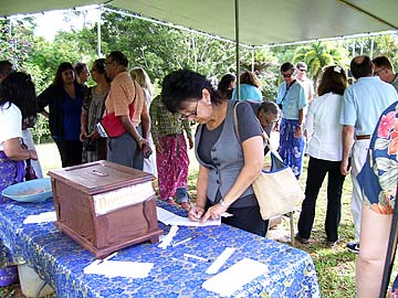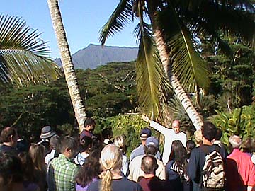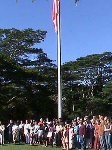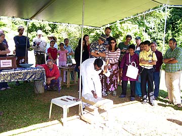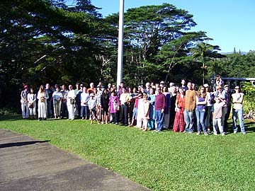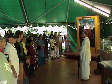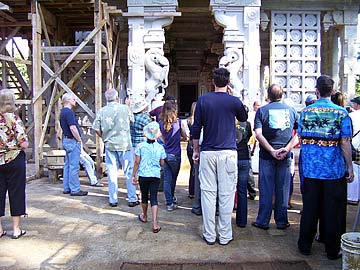With the work of the Siddhidata Kulam to build a railing we can now bring guests up on the foundation. Guests looking through the temple to the inner chamber, the sanctum sanctorum where one day soon the 700 pound Siva Crystal Linga will radiate a spiritual force which will bring thousands to Kauai.