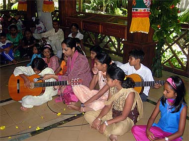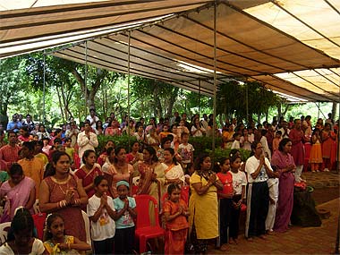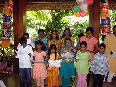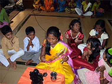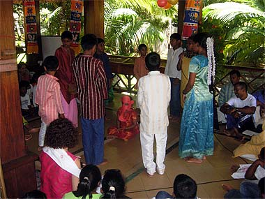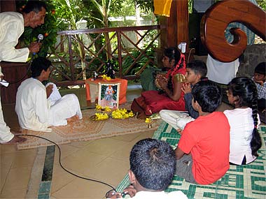 The event was organised by catalyst trainees teaching Bodhinatha's Saivite Hindu Religion (SHR) series to some hundred youth all over the island. Each class presented an item. Most of items were short sketches based on the teachings as presented in the SHR series. Here parents and youth stands up for the arati to Lord Pancha Mukha Ganapati.