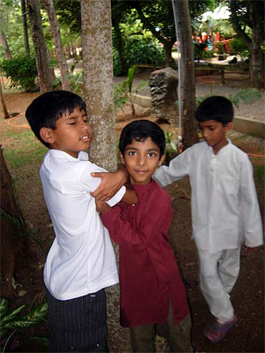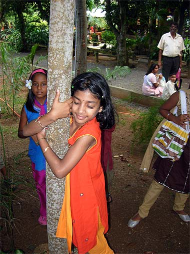These SHR youth are making history at the Park. They are the first ones to hug as devotees do at Kauai Aadheenam, our still small Mauritius rudraksha tree at the Park.