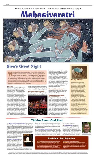 Here is Mahasivaratri. These pagers are designed very simply with an explanation of the meaning of the festival, when and how it is observed. Included are some key points of Hindu philosophy related to the festival and recipes. Of course for Maha Sivaratri the recipe is H20 Water!