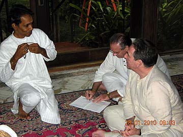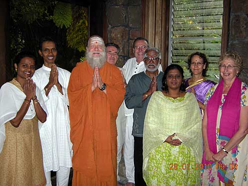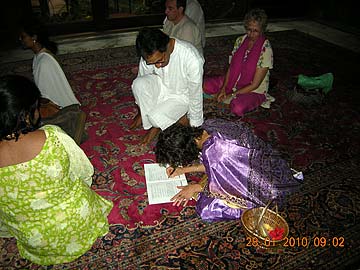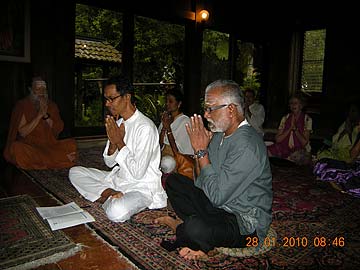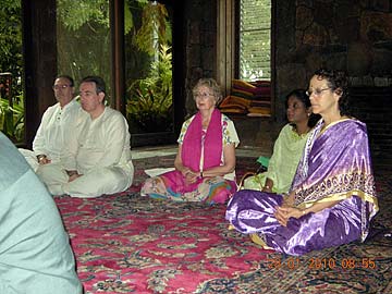 Earlier in the morning Wailua Mission members and our pilgrims from Singapore gather with Sivakatirswami in the Guru peedam. Bhani sat in front of the throne of the Kailasa Parampara and recited the four vows of the Arul Sishya.