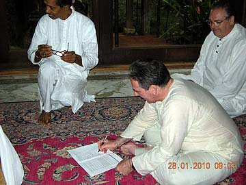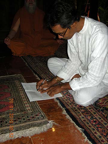 After reciting each one, Shakahara vrata (vegetarian vow, re-affirmed), Ahimsa Vrata (Vow of Nonviolence), Kailasa Parampara Vrata (Vow of Dedication to the Lineage) and the Dasama Bhaga Vrata (Vow to Give God's Money, tithe 10% of one's income), Bhani signs...