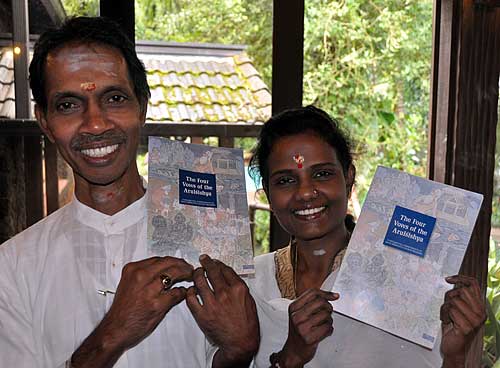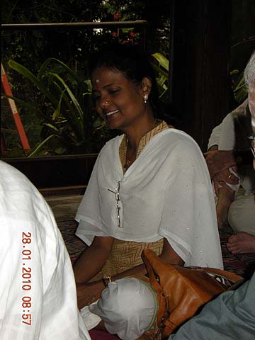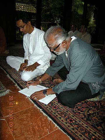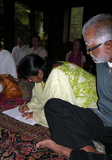 Rema Devi, Bhani's wife, smile as husband signs. She had already taken her vows a month ago in Singapore.