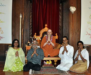 Long time sishya Kulapati Dohadeva and Kulamata Nagavathy from Singapore (left) are on pilgrimage. It is their 30th wedding anniversary. Yogi Bhani and Rema Devi on the right are also from our Singapore mission, and it is their 26th wedding anniversary. They met this morning for darshan with Bodhinatha and had a long 1 1/2 hour talk with him.