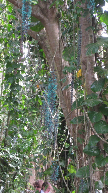 The Green Jade vine is in full bloom with many blossoms covering it's host tree.