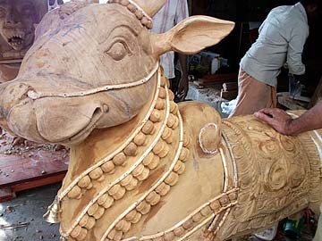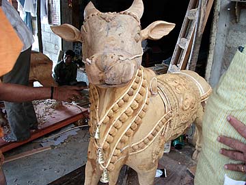 This beautiful Nandi is for another temple. Done by Srinvasa sthapati. He will be carving the Iraivan Temple Sanctum Door. Sthapati wanted to show it off because the piece is all wood and a great deal of detail is involved.