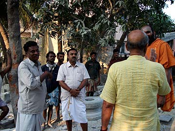The group discussing different aspects of stone carving. To the left of Selvanathan Sthapati is Subramaniam Sthapati. He carved our large Dakshinamurthi and Shanmuga Deity for Kauai. He was also the carver of the Panchamukha Ganapati and all the large deities for our Mauritius Dharmasala.