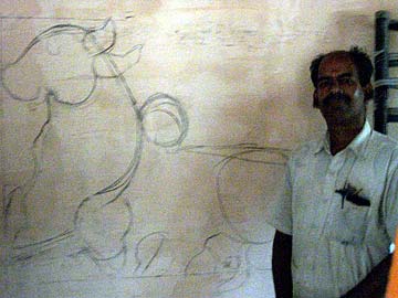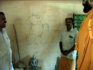 We are at Loganathan Sthapati's patrai (shop). You can see the life size sketch of Iraivan Nandi on the wall. Loganathan Sthapati is considered to be one of the most artistic carvers in the Mamallapuram area.