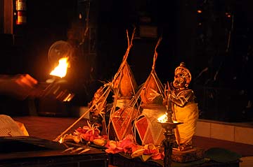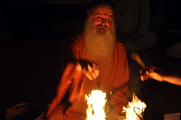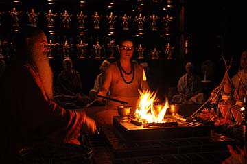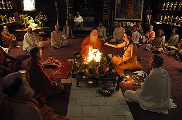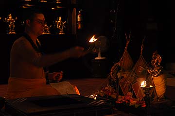 Paramacharya Palaniswami presides and makes homa offerings and burns the prayers in Bodhinatha's absence.