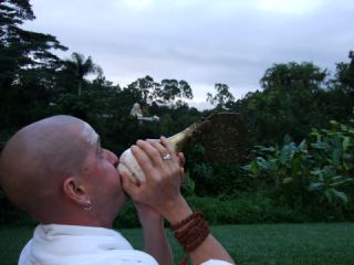 Sadhaka Tejadeva blows the conch to celebrate the moment and call all the divine beings to join us.
