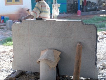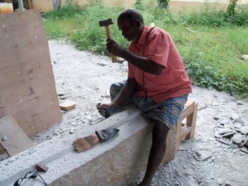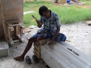 March 11, 2010In India today dozens of stone craftsmen are working on Iraivan projects, and other sculptures for the monastery. Here the YA step, one of the NAMASIVAYA steps up to the sanctum, is being carved. The finished side is away from us.