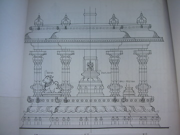 Meanwhile, the major project in Bengaluru is the carving of the Nandi Mandapam, shown here (though the 45-foot-tall flagpole is just barely seen at the top of the drawing). This little temple within a temple will have some of the most elaborate and detailed sculpting of all, and a charming Nandi will sit contentedly within his stall. Nandi the bull represents the ego or personal identity of each soul and also the desire for realization of God. He sits in front of the flag pole, beholding Siva night and day.
