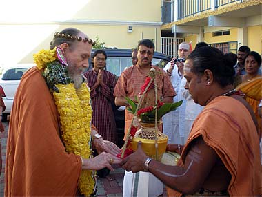 The sivachariyar of the temple welcoming Bodhinatha with a traditional kumbam after a pada puja.