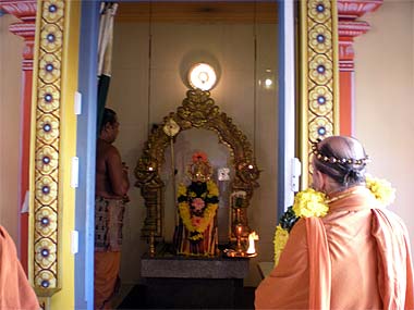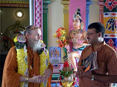 Then Bodhinatha proceeded inside the temple where the priest conducted an arati to Lord Ganesha, Lord Muruga and Lord Siva. Here is Bodhinatha in front of the Muruga Shrine.