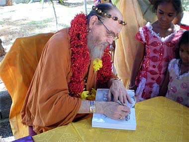 The last part of the event was the signing of books. Hundreds queued up to have their newly purchased Himalayan Academy publication signed by Bodhinatha, while bhajans were aired live.