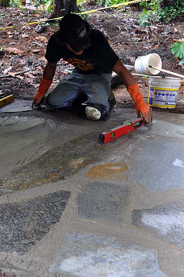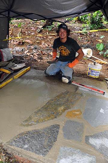 After a few days training and apprenticeship under Kulapati Satya Palani, Jonathan is now flying solo on the tile installation.